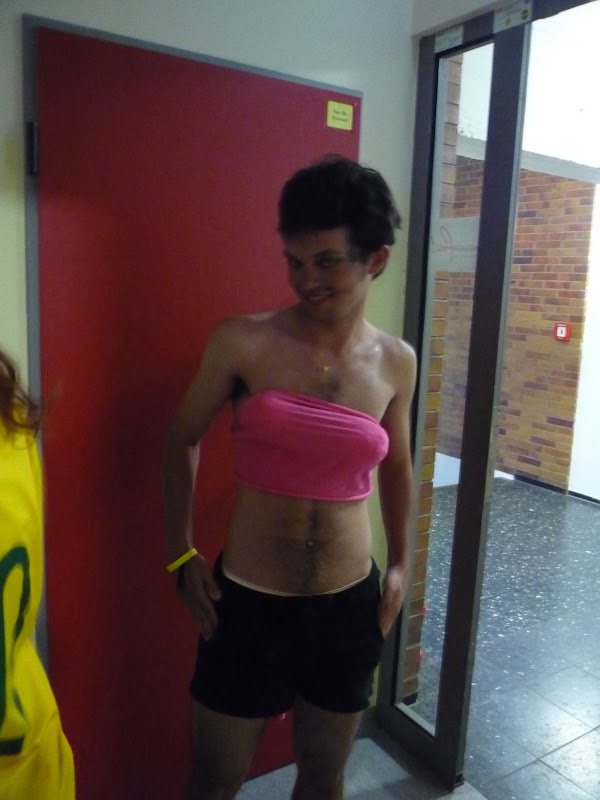 À tarde fomos tomar banho de piscina, e a noite rolou um desfile, que contou pontos para a competição esportiva que estávamos fazendo. Entretanto não foi um desfile qualquer, mas sim um com homens vestidos de mulheres e vice-versa.